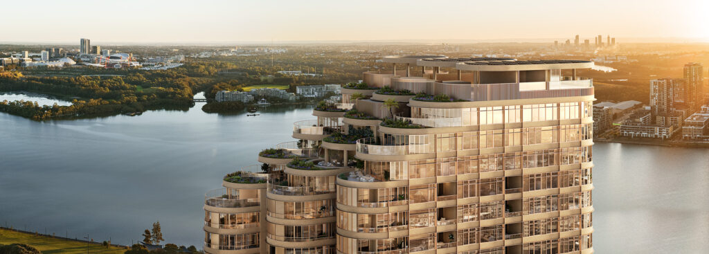 Cascade has a striking design with a slender tower grounded by a four-storey podium. The tower is divided into three forms, with a distinctive silhouette that resembles three fingers. The design optimises amenity and privacy while maximising views towards both Sydney CBD and Homebush Bay.