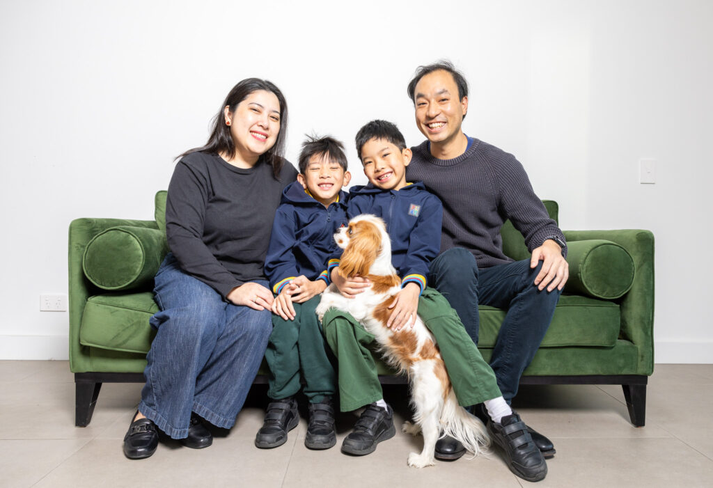 The Daily Telegraph Friday 13 June 2025 Unit Vs Houses David Ung Oscar Ung Charlie Ung and Rose Ung and dog Kody are happy in their Rhodes apartment the facilities and location suits their family lifestyle. Picture Thomas Lisson